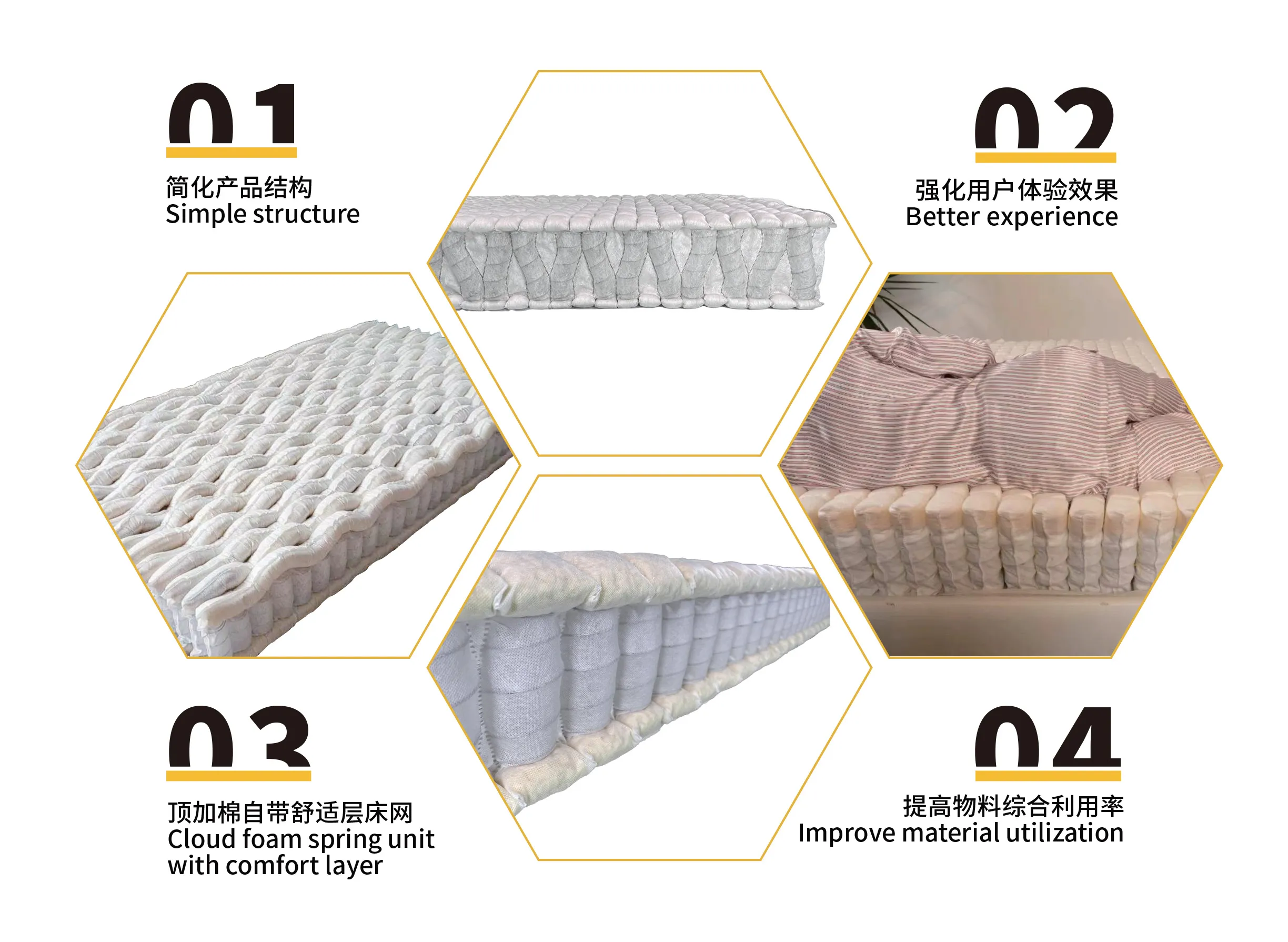 Looking for a quick-assembly mattress core with both comfort and support? Our CLOUD FOAM SPRING UNIT combines pocket spring durability with crushed foam, latex, and cotton to offer built-in pressure relief and ergonomic support. Ideal for electric or adjustable beds, this spring core eliminates extra foam layers and reduces production time. It’s a modern solution for mattress factories seeking efficient and cost-saving alternatives.